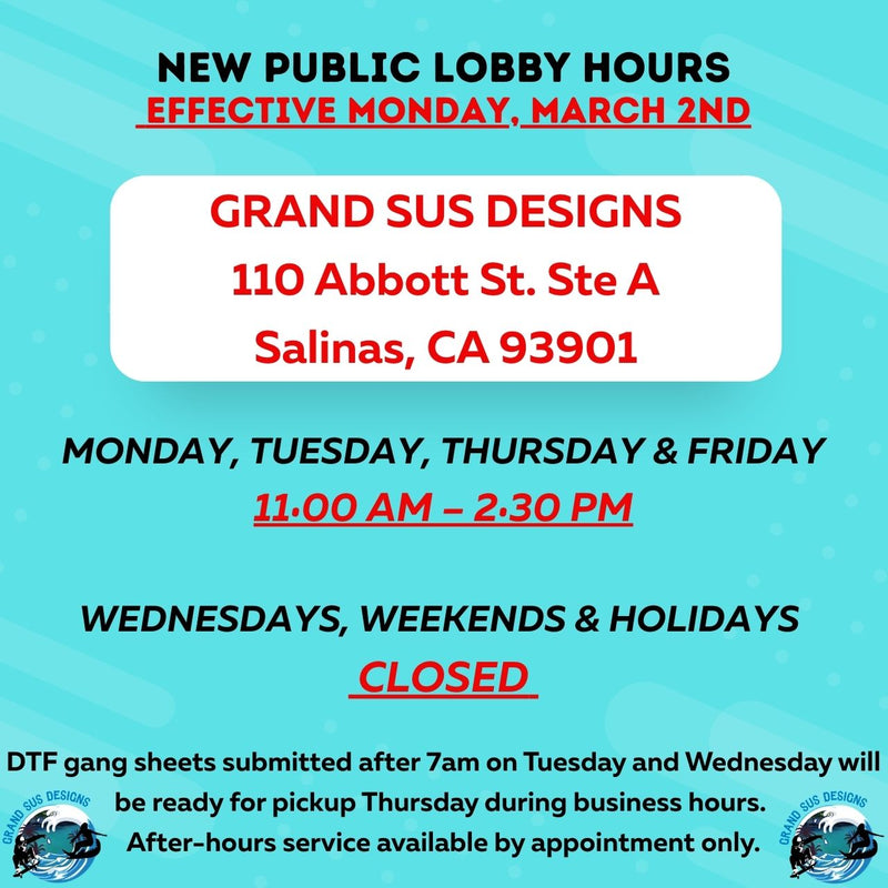 DTF gang sheets submitted after 7am on Tuesday and Wednesday will be ready for pickup Thursday during business hours.